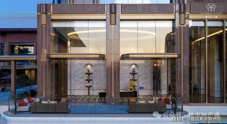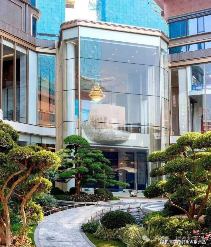入户大门:门头高度9米,顶部金色花瓣做了钻石的切角,滨江传统土豪香槟金,入户雕塑+水景搭配,两侧是加纳利海藻树+迎客松,确实做的还不错,就是有点太标准的滨江风格了