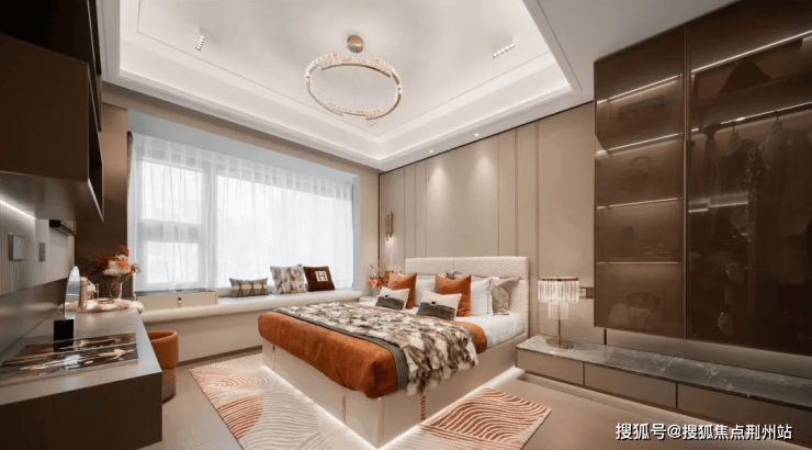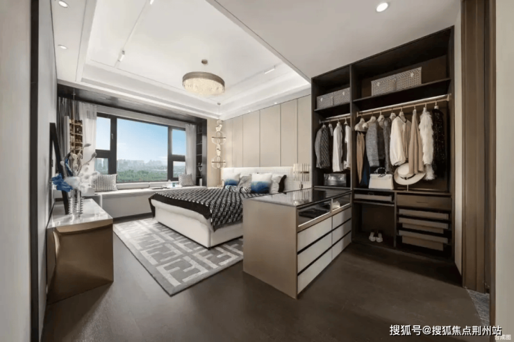步入主卧,预留步入式衣帽间将休憩空间与带有浴缸的卫生间隔开,丰富日常生活的动线,充分满足高端人群对居住空间的需求, 270°揽景飘窗让采光及视野双重延伸。
