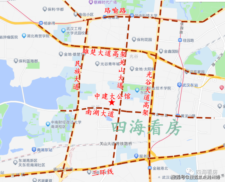 自驾:项目沿关山大道向北可直达华科、光谷广场,街道口等商圈,沿南湖大道上光谷大道高架,有匝道口可以走雄楚大道高架和三环线,快速到光谷中心城。走雄楚大道向西可直达二环线。