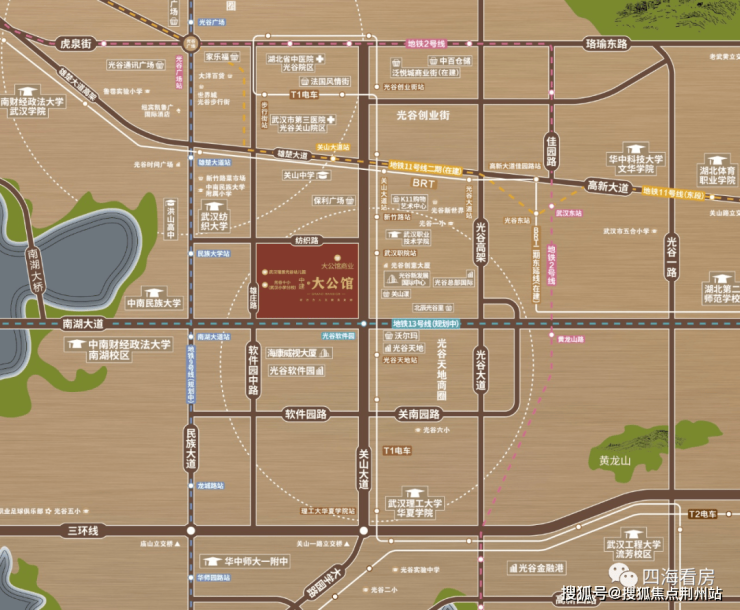 中建大公馆位于关山大道与南湖大道交汇处,楼市划分属于关山大道核心板块,行政划分属于东湖高新区,距离二环线6公里、三环线4.5公里,属于2.5环。