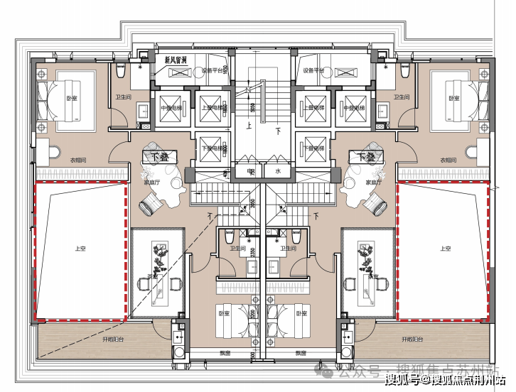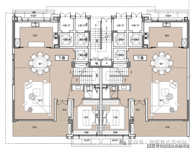 叠加230-275㎡,得房率超90%,客厅挑空,上叠送露台,下叠送院子;