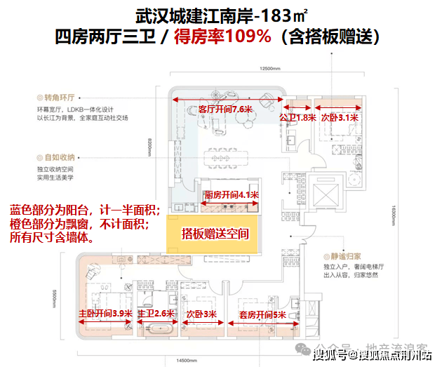 183㎡也是4房3卫,不含电梯前室的得房率是109%,较区域内新规项目得房率普遍高10%及以上。项目得房率高主要是因为入户玄关后面有一个打搭板赠送空间,这个空间的面积有13.2㎡,虽然现场没有展示,但业主后期可以使用。