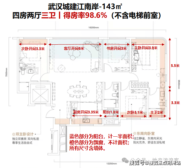 143㎡户型不含电梯前室的得房率都超过98%,中寰悦府148㎡不含电梯前室得房率89%、中海东湖玖章141㎡不含电梯前室得房率85%,武汉城建这个户型得房率比武昌区目前在售新规项目得房率高。得益于较高的得房率,项目户型实现了四房三卫的功能性,在功能性上有升级。