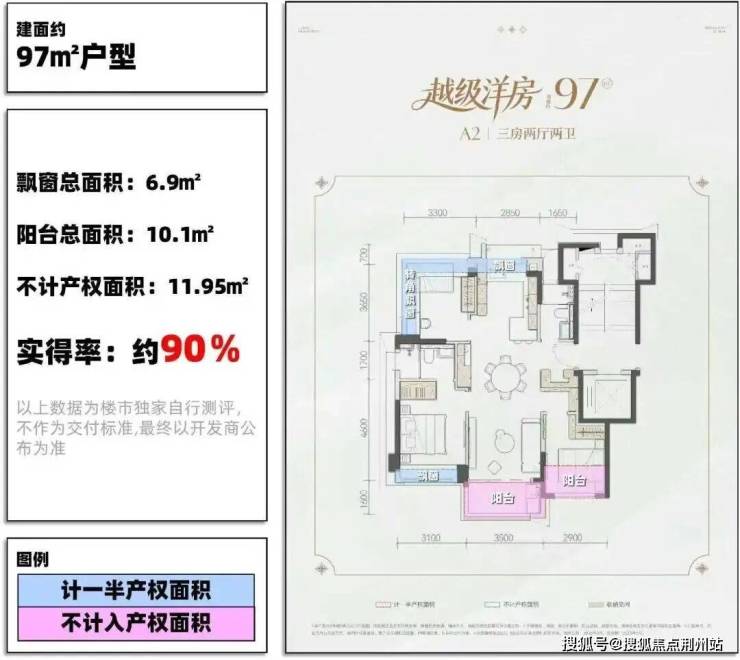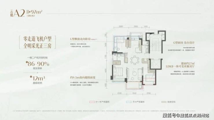 约97㎡A2户型整体实测下来,实得率已经来到了90%!