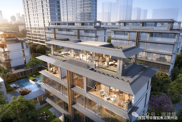另外外立面还使用LOW-E灰玻璃与竖向机翼形圆弧铝板相交融,扩大透光面的同时进一步提升了户与户之间的隐私性。