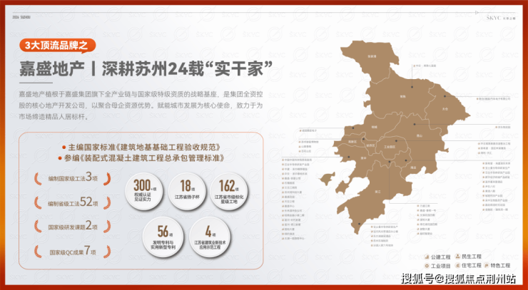 嘉盛地产深耕苏州24载,是名副其实的 “实干家”!手握国家级特级资质,参编多项建筑行业国家标准,斩获过扬子杯、星级工地、300+权威认证等百余项行业荣誉。