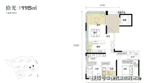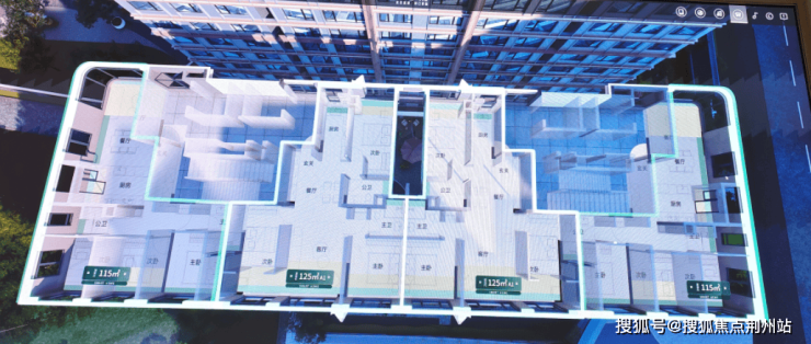 建面约115平的边套三房:分布在1号楼端头边户,3个卧室朝南,餐客厅一体全景舱设计,带独立电梯前室。