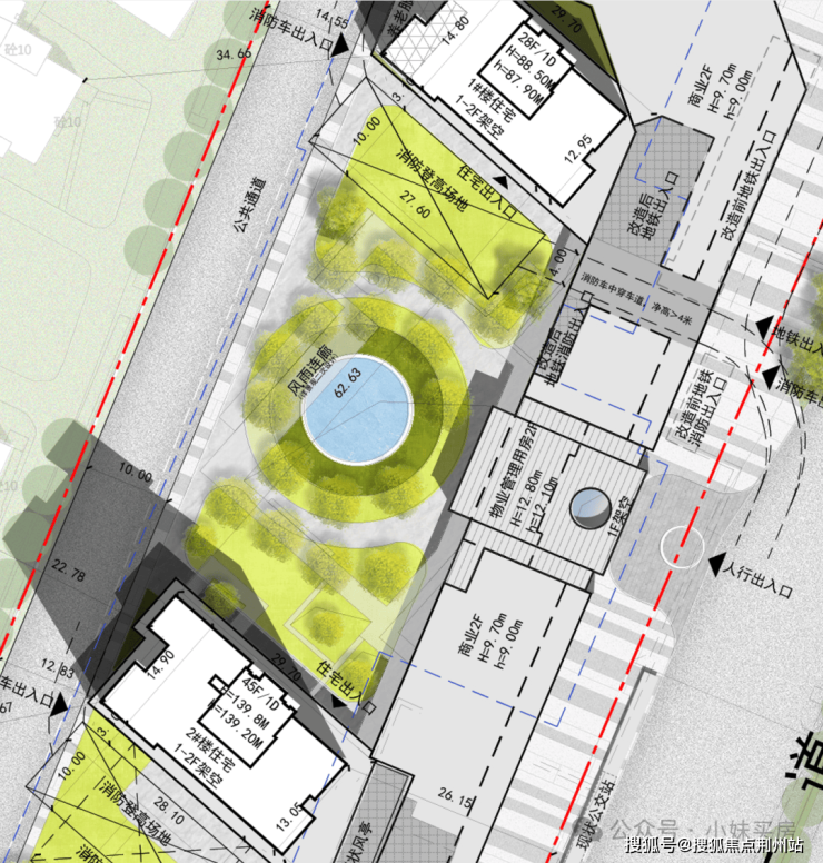 1号楼位于项目最北端,总高28层,1个单元,1-2F为架空设计,东侧为改造后的地铁出入口以及2层商业,南面为小区园林,小区人行主出入口在1、2号楼之间,两栋楼的楼间距约62米。