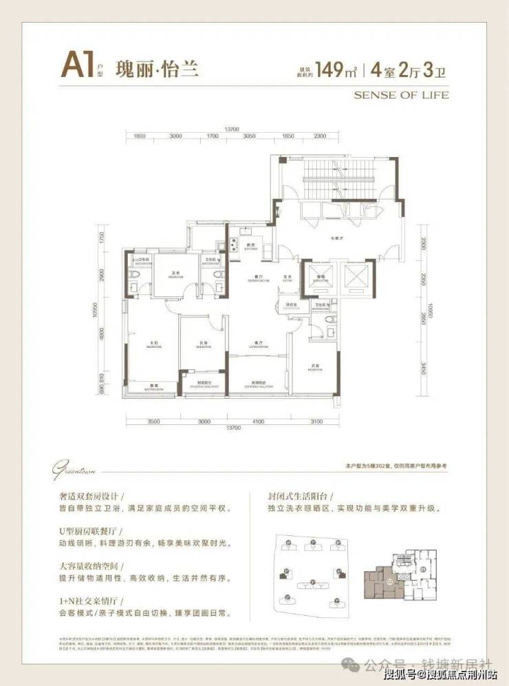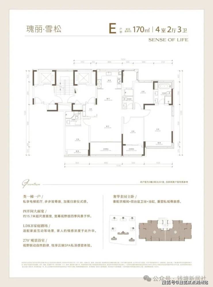 建面约170方户型实现“主卧小家化”,奢华套房式主卧,奢配衣帽间+双台盆卫浴+浴缸,同时配有大飘窗,采光和景观面不输大客厅。它还做到了厨房、餐客厅、封闭式阳台一体化,LDKB家庭式剧场,让每位家人享受舒适的休憩时光。