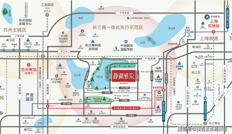 距苏州南站仅7公里,通车后15分钟到虹桥。驾车10分钟到青浦,30分钟到虹桥。驾车10分钟达到上海17号线西岑站,规划苏州地铁10号线穿行而过。