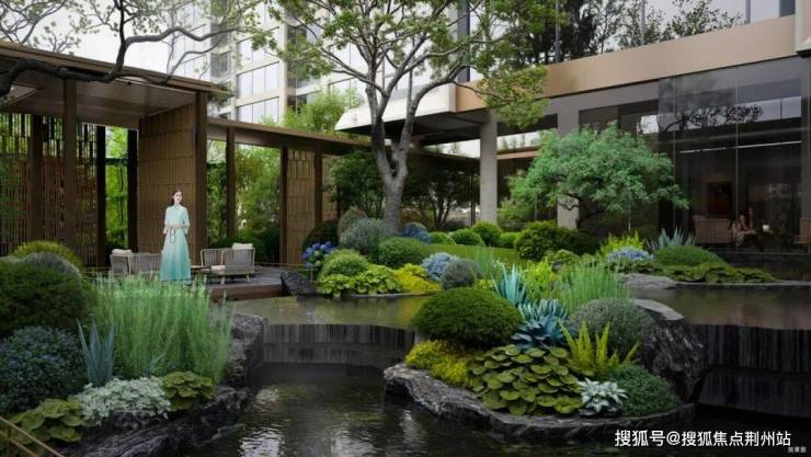 以现代材料,勾勒千年风骨。 入口处严选黑山石,以极简的堆叠艺术形成静水面,倒映天光,如一幅悬浮的现代水墨画。长达80米的襄阳首个结合游憩连廊打造的无界静谧花园,则以轻盈的特选铝板替代传统木构,在遮风挡雨的功能之上,成为一条串联时光与风景的艺术廊道。