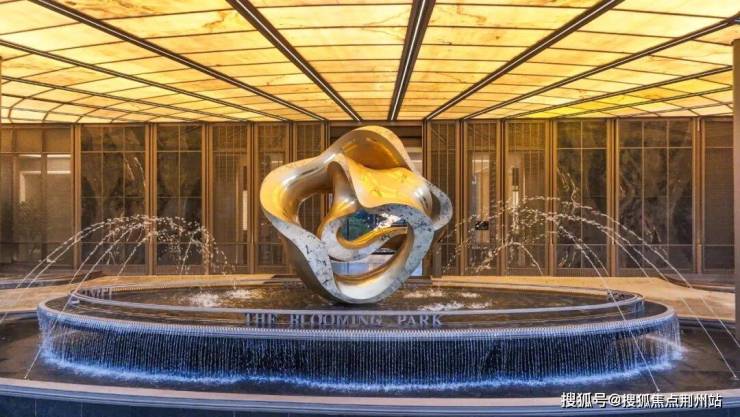 在门廊之前,绿城更是不计成本地落下四组叠瀑水景,涟漪生花;中央水景以潘多拉奢石为底;落客区的地面也采用了扇形石材铺装……