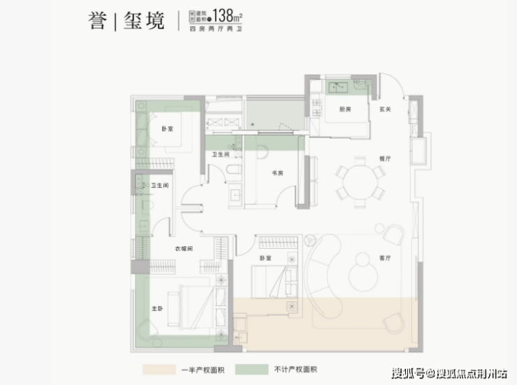 138㎡四房两厅两卫:约62㎡LDKG联动空间,南向12.4m面宽,主卧270°观景窗,8.2m宽幕阳台。