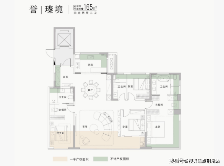 165㎡四房两厅三卫:独梯入户,约70㎡洄游空间,南向16.2m四面宽,主卧270°观景,8.8m宽景阳台。