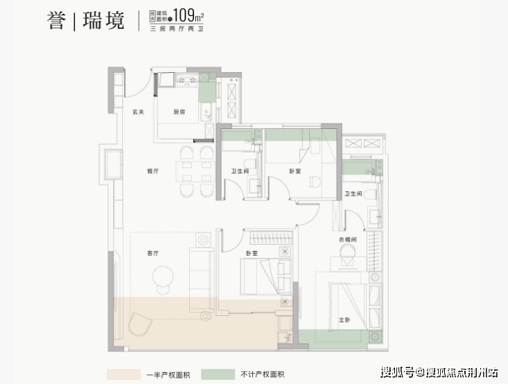 109㎡三房两厅两卫:LDKG一体化设计,约51㎡家庭互动空间,主卧约20㎡套房,南向7.2m宽景阳台。