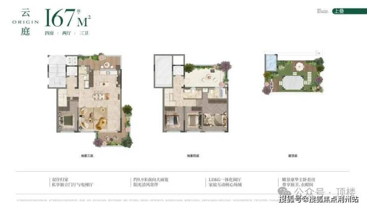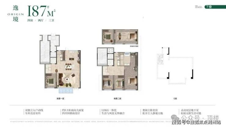 下叠面宽约9.9米,一层为前庭后院双入户与LDKG一体化,大横厅是一大亮点;客厅上空是挑空空间,未来可打造为双套房设计。
