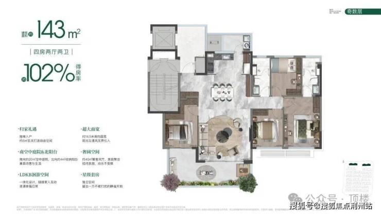 四代宅洋房整体户型为4房2厅2卫,4开间朝南设计,奇数层与偶数层的区别就在于,空中庭院与客厅或卧室相连的区分;并且值得一提的是,项目还打造了北阳台。