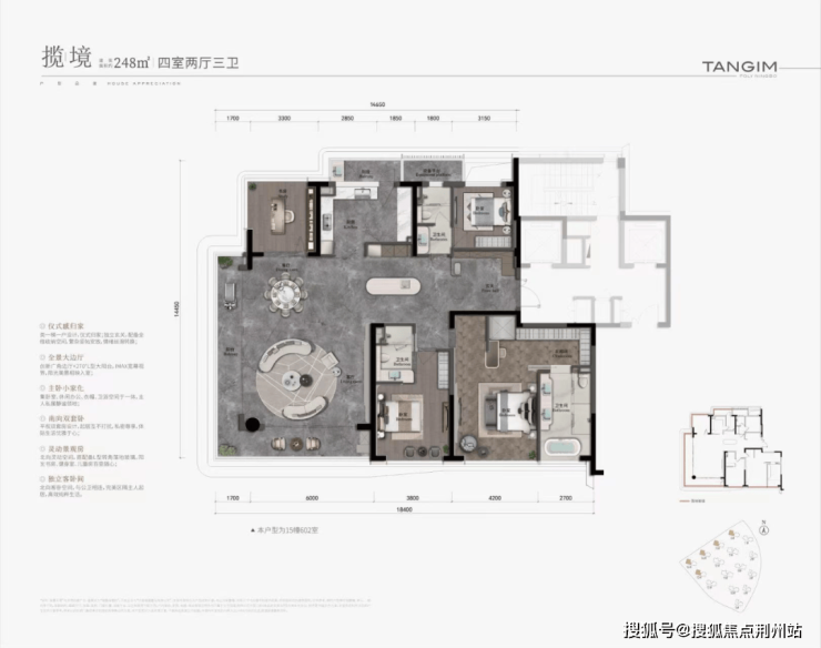 主推户型:建筑面积约248㎡户型,采用大平层迭代端厅设计,客厅270°采光搭配L型景观阳台,打造IMAX级视野;超尺玄关空间+北侧家政阳台让生活空间规划更妥帖;小家化主卧与南向双套卧,进一步提升居住质感。