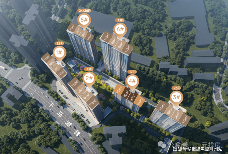 项目一共6栋住宅。因为建筑限高100米,所以楼栋总高为17-24-26-28-33F。
