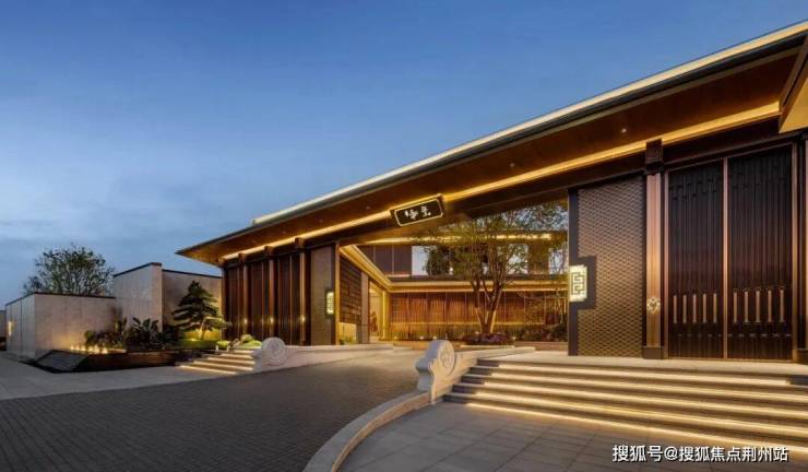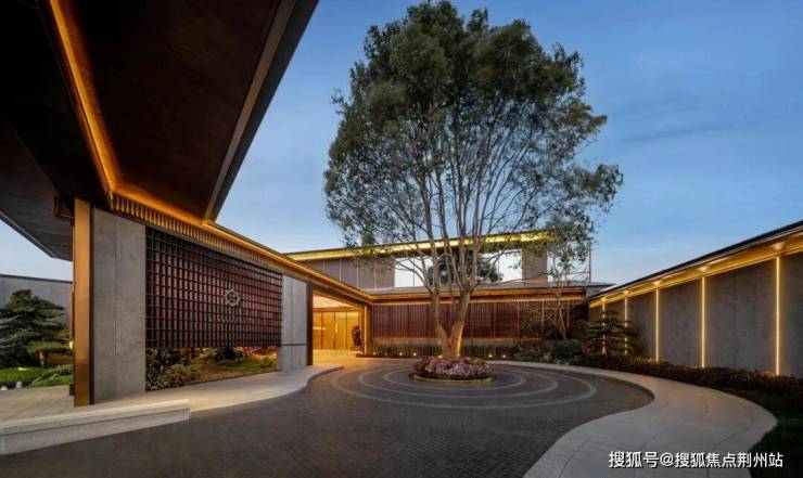 【入口庭院】天圆之境汲取曼谷度假酒店设计灵感,匠心独运的天圆环岛,遍植香樟树,四季常青,注入生机与宁静。岛下铺设宋代官道风格弹石路面,古韵盎然,融合古今景观。