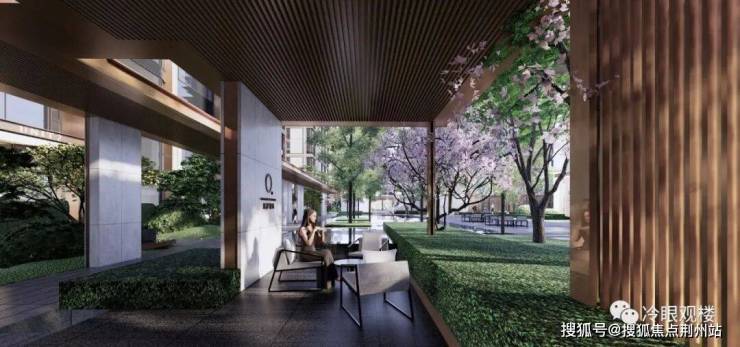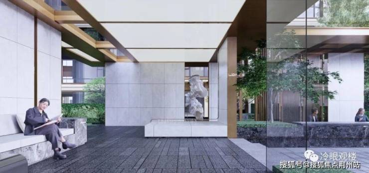 连廊尽头连接着一座景观会客厅,内设坐凳、艺术品雕塑等,可供业主品茗交谈、艺术赏鉴。