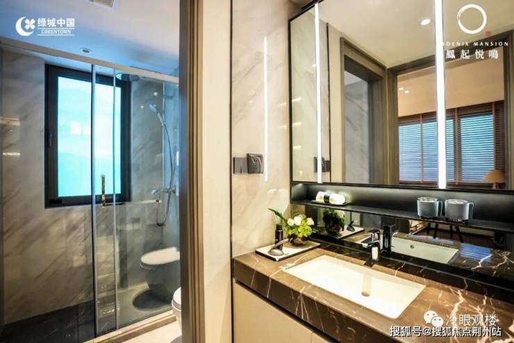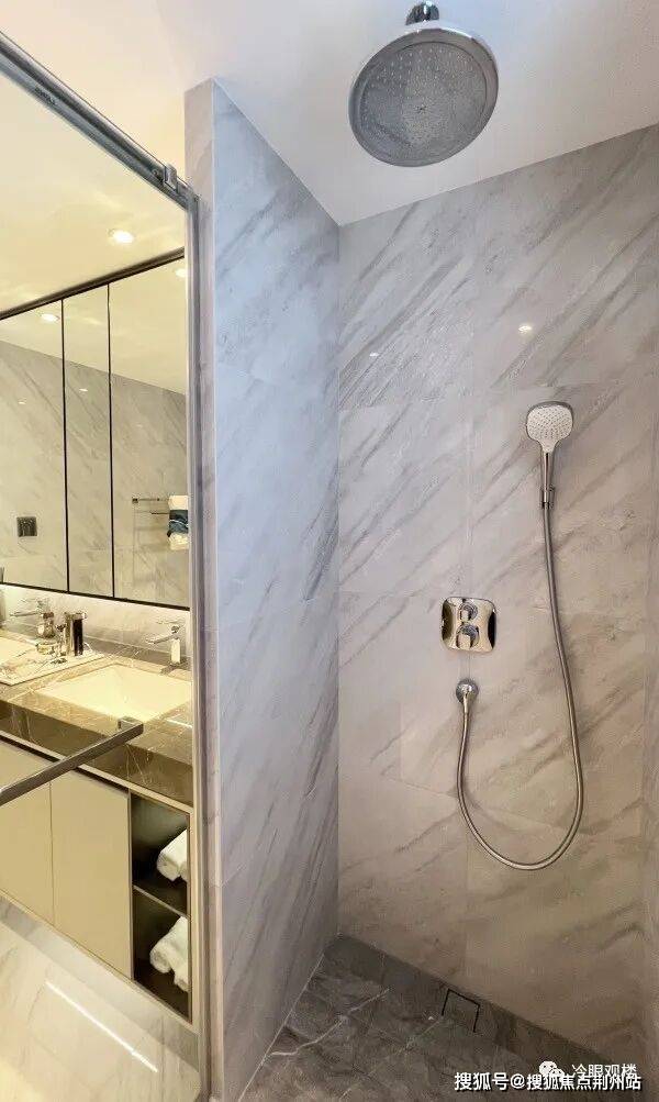 比如浴室柜的台面,选用的都是石材;主卫都是双手盆配置、智能马桶,淋浴花洒还是入墙设计;镜柜带内嵌灯带,内部预留吹风机插座。