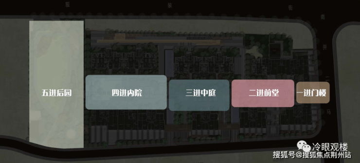 一进门楼,二进前堂,三进中庭,四进内院,五进后园。