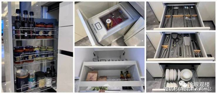 燃气灶下的抽屉都留好了分隔,更方便收纳刀叉、锅铲、开瓶器、压蒜器等小物件。甚至连抽拉式的成品米箱都预留好了。