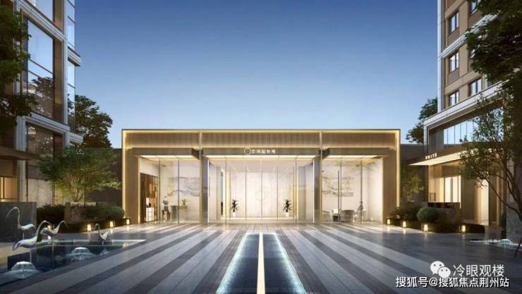 走道两侧的喷泉水景,营造对称布局的仪式感。地面的仿水波纹石材特色铺装,让业主放下一天工作的疲惫。