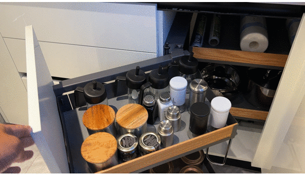 建筑面积约150㎡户型的橱柜转角处,还安装了怪物拉篮,充分利用地柜内侧的死角空间,拿取物品非常方便。