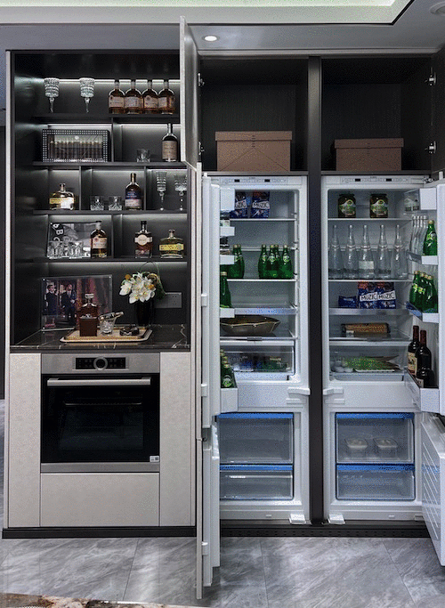 像建筑面积约180㎡户型的餐边柜,自带的蒸烤箱、操作台以及嵌入式冰箱,临近餐桌,非常实用。