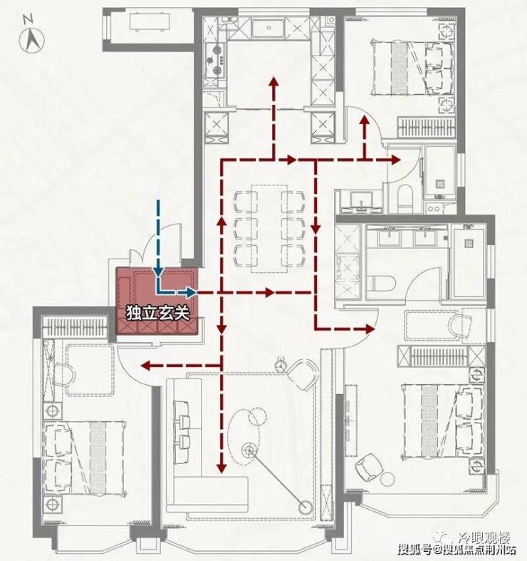 以建筑面积约150㎡三室为例,独立玄关位于户型的一个角落,访客在门口无法看见室内全貌,有效保护了隐私,业主归家也更有仪式感。