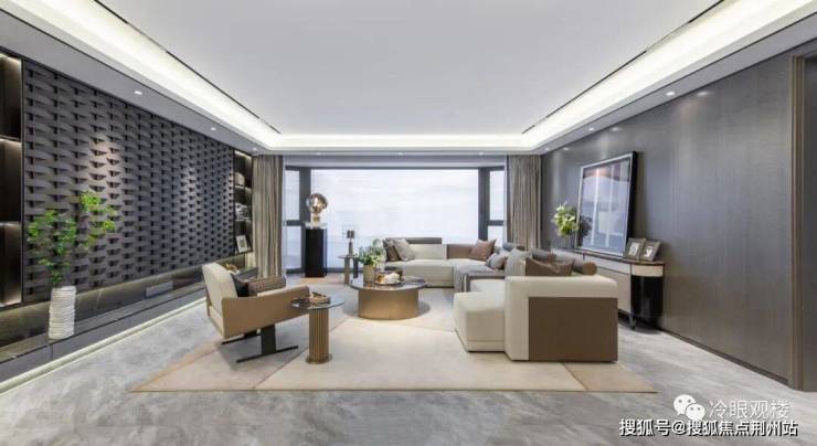 定制的皮革编织背景墙,是不是和BV最有辨识度的编织包有几分神似?成为整个客厅的视觉焦点。