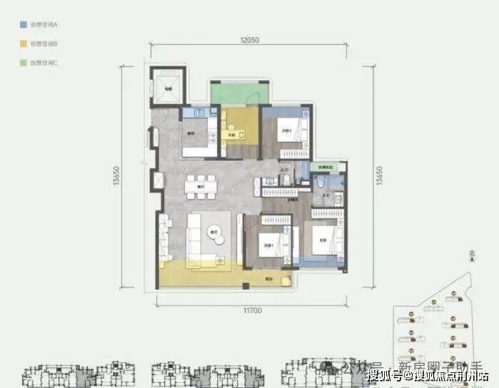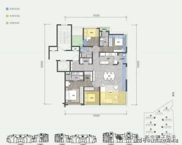 规划计容面积约135平户型,不仅是大横厅+四房,还做了南向双套房设计。