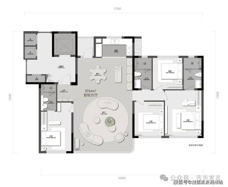 约34㎡奢华主卧套房 | 约16m横向大面宽 | 极简承重墙设计