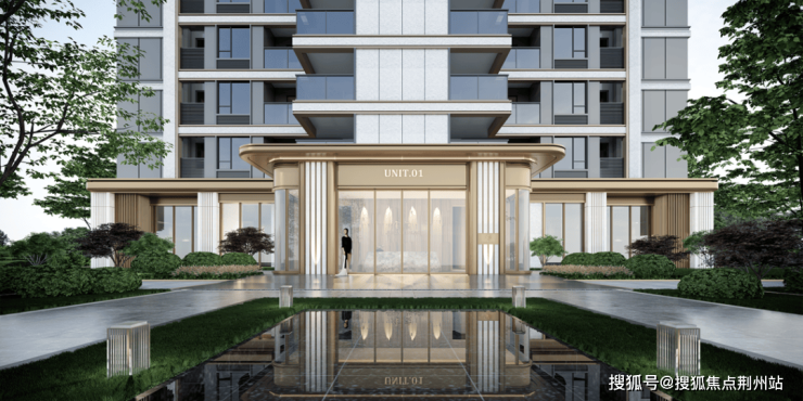 单元入口简洁、轻巧、通透,通过局部装饰元素和材质搭配,整体呈现:东方气质、礼序归家、景观相融,采用石材、铝板、高透玻璃等材料, “晓棠”元素也运用其中,打造归家近人精致尺度。