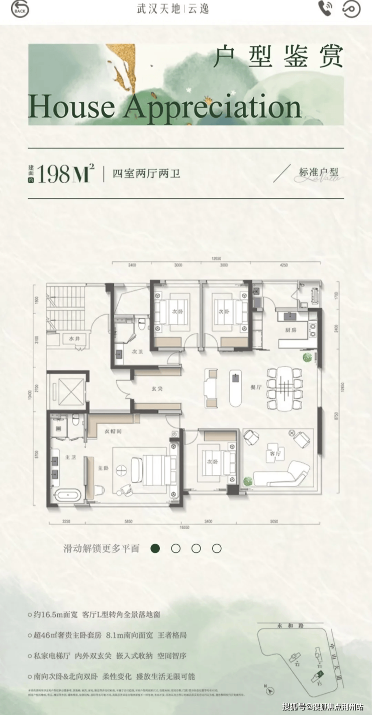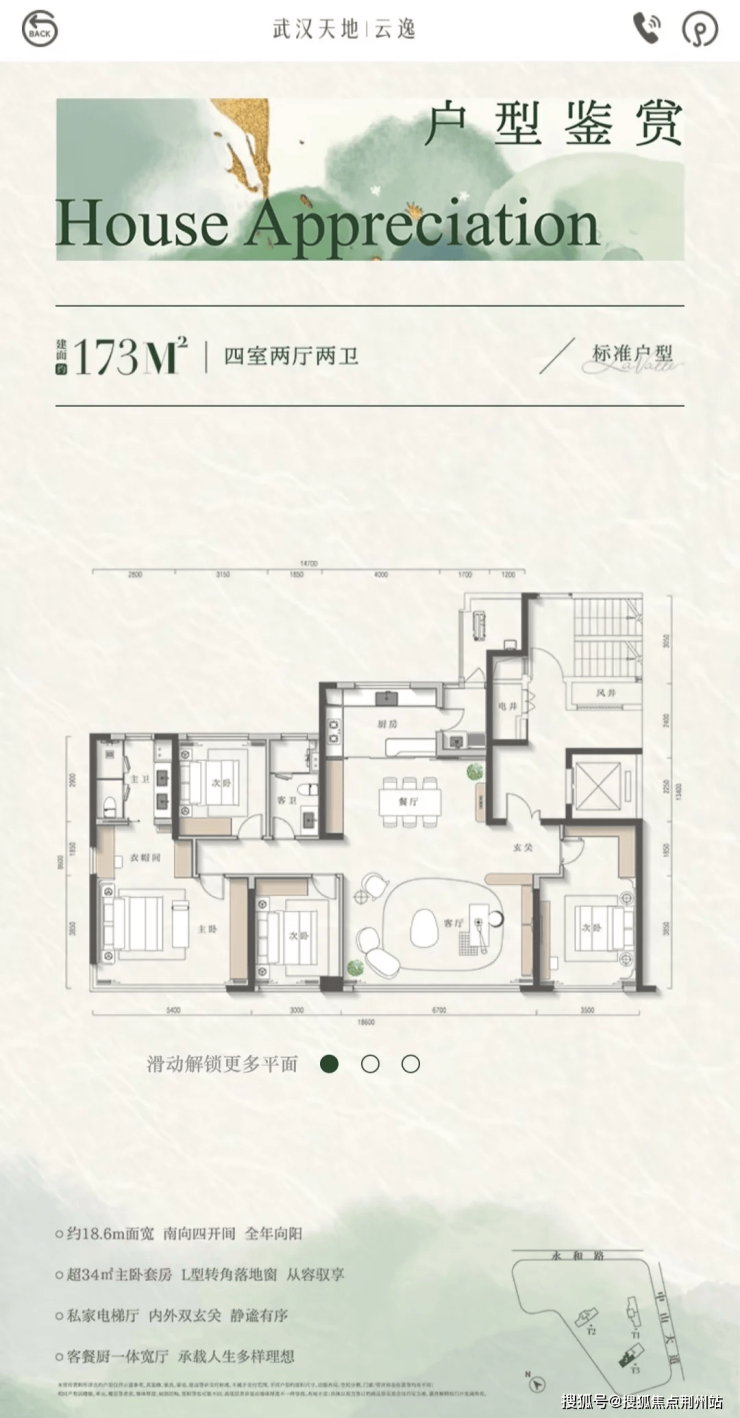 武汉天地云逸一共3个户型,分别为建面约147㎡、175㎡和198㎡,得房率超90%。