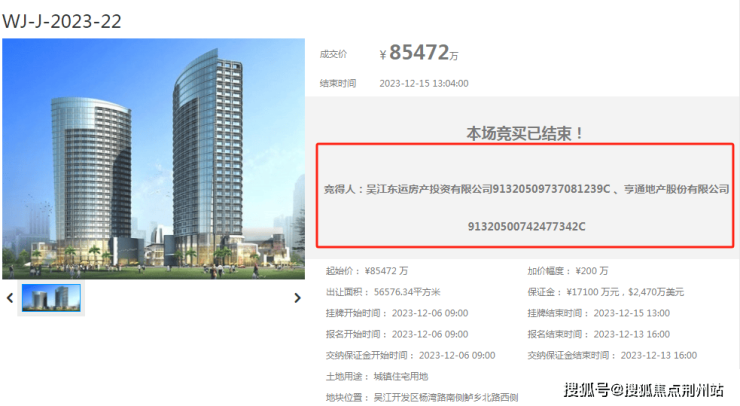 中铁青云府,即WJ-J-2023-022号地块,为商住用地,位于吴江开发区杨湾路南侧鲈乡北路西侧,由东运房产&亨通地产拿下,成交总价8.54亿,成交楼面价10500元/平,溢价率0%,成交楼面价10072元/平!