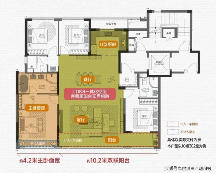 户型采用LDKB 一体化设计,约6.7米横厅与约10.2米双联阳台无缝衔接,打造出集社交、休闲、观景于一体的公共区域。