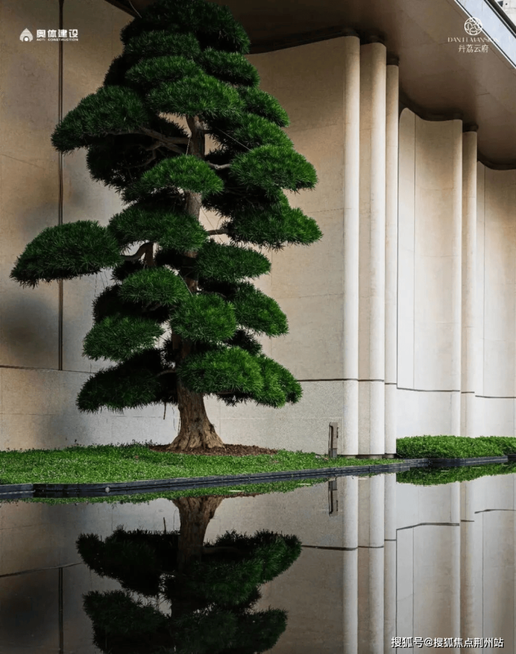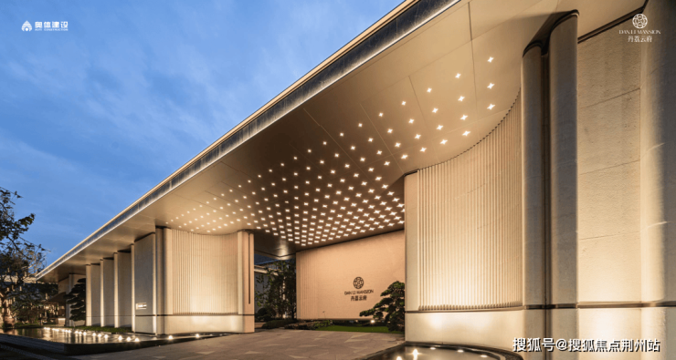 丹荔云府的小区大门气派非凡,门庭宽敞至极,借鉴自然植物生长之美,融汇书香雅韵,构筑了一道长约60米、高约4米的尊贵门庭。其门庭不仅显赫而不失温润,更展现出独一无二的风格。并且大量采用的保加利亚进口维纳多石材,呈现出细腻的米白质感,与上方柬埔寨进口的温德姆灰大理石形成鲜明对比,相映成趣。门前迎客松挺拔而立,两侧对称的水景点缀其中,营造出极具视觉冲击力的迎宾景观。