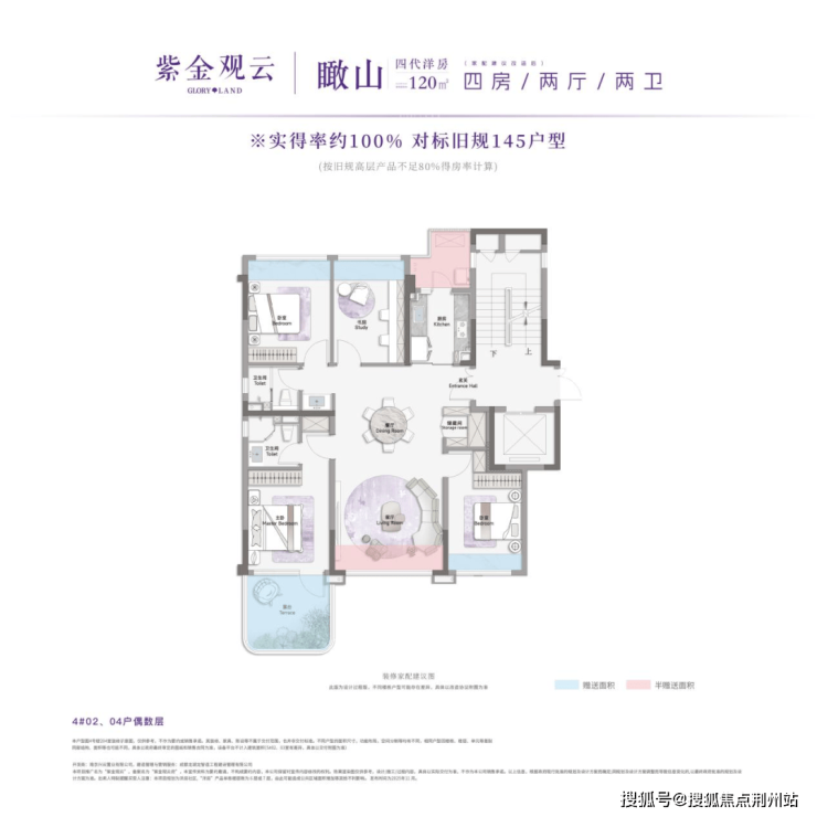 建面约120㎡四房两厅两卫:户户独立电梯厅,实得率约100%,采用LDK一体化设计,南北通透;南向约10.6米大开间,主卧套房连接约10㎡超大露台,直面紫金山;南北次卧均有飘窗设计,北侧还可延伸打造家政空间,让空间利用最大化。