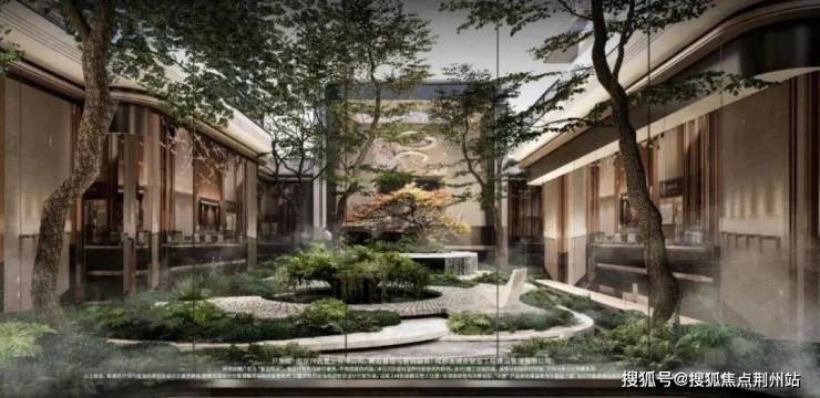 通过“S”型的游园小径去引导视线,“拉长”视觉上的空间效果,融入玄武文脉,下沉庭院中央打造“九转龙鳞”核心景观,配合超白玻璃,未来业主在会所内,也能直接享受和核心景观的视线交汇,真正将山水栖居融入业主日常。