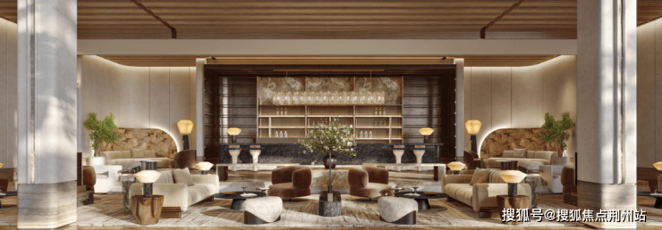 整个示范区用到墨玉、诺曼灰、范思哲黑、水墨玉、贵州木纹、白玉、青玉等石材和奢石,所见皆石材。大门处用贝金米黄石材为其底打造了80米的全石材超级城市界面,搭配深古铜铝板点缀。在如此量级的项目中,这种配置算是独一份。包括会所空间也采用了全石材打造,这在新玄武板块是首创,在全南京也是相当罕见。