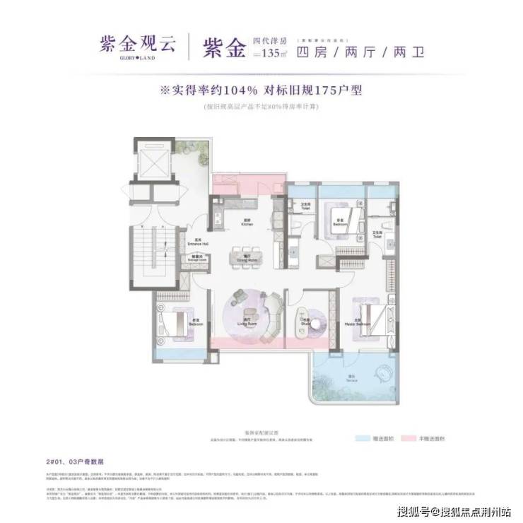 建面约135㎡四房两厅两卫:私享光厅,全明入户;采用LDK一体化设计,实得率高达约104%;南向约14.25米开间,主卧套房连接约15㎡超大南向露台,和紫金山的自然交互直接拉满;储物空间也非常足;