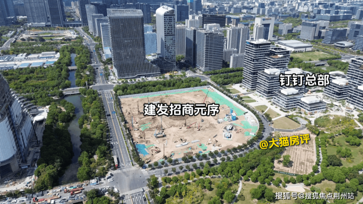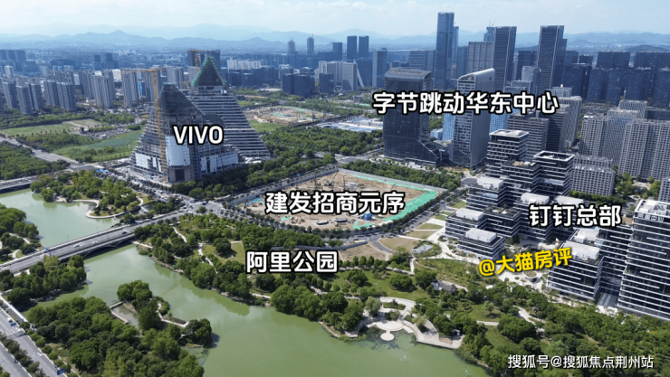 周边邻近钉钉总部、VIVO等,南面是绿地公园、河道,居住环境其实还可以,实景航拍时间是25年8月底。