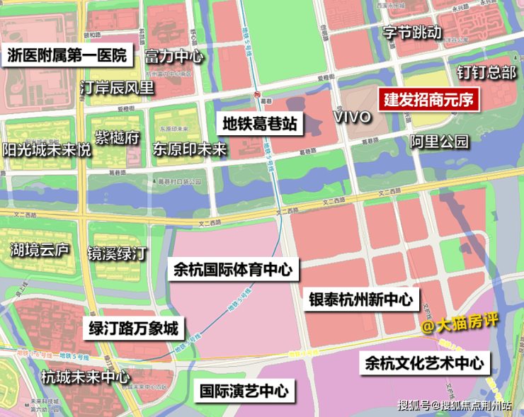 周边用地规划:主要由商业(>70%)、公建、住宅构成,空地和在建工程较多,余杭国际体育中心预计2027年完工,国际演艺中心项目预计2028年底前建成投用,未来整体界面还不错。