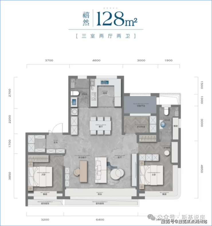 南向次卧3.2米;客厅开间6.4米,阳台+装饰廊架,外扩大阳台设计;主卧3.6米开间,L型大转角飘窗。