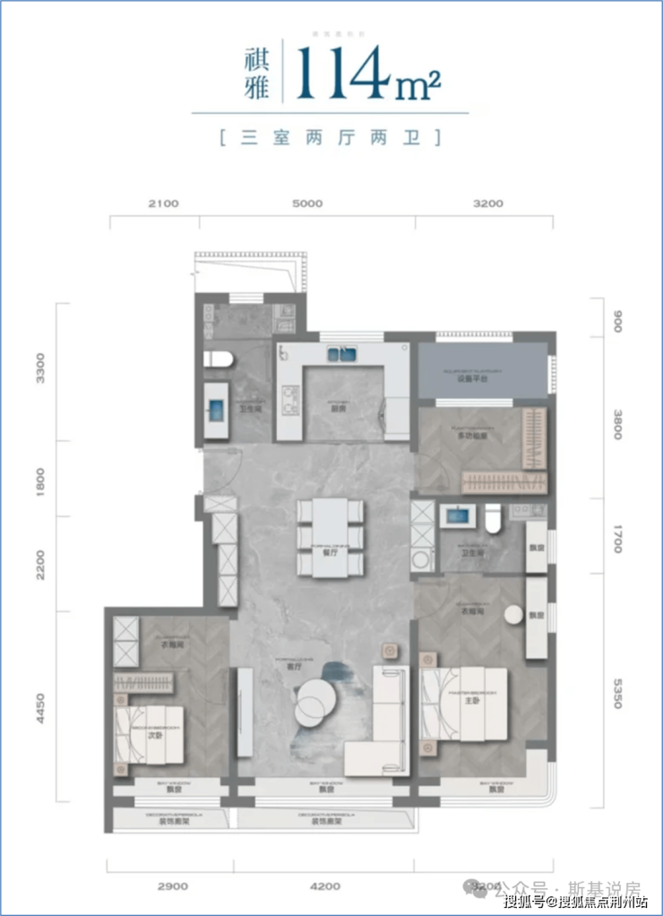 97㎡户型的尺度升级,客厅开间4.2米,南向主卧L型转角飘窗,衣帽间及卫生间开窗全明。