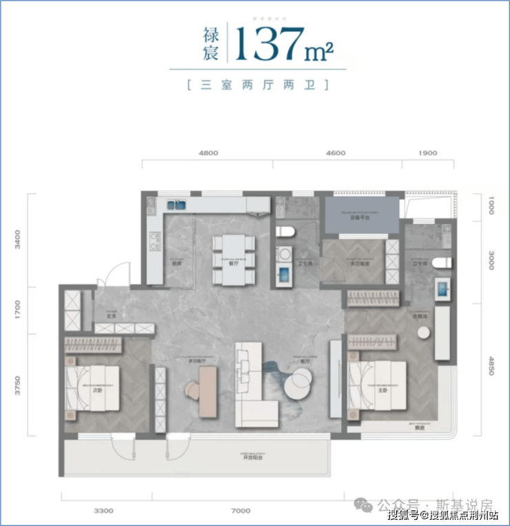 南向次卧3.3米;客厅开间7米,开敞式大阳台,连接次卧阳台空间;
