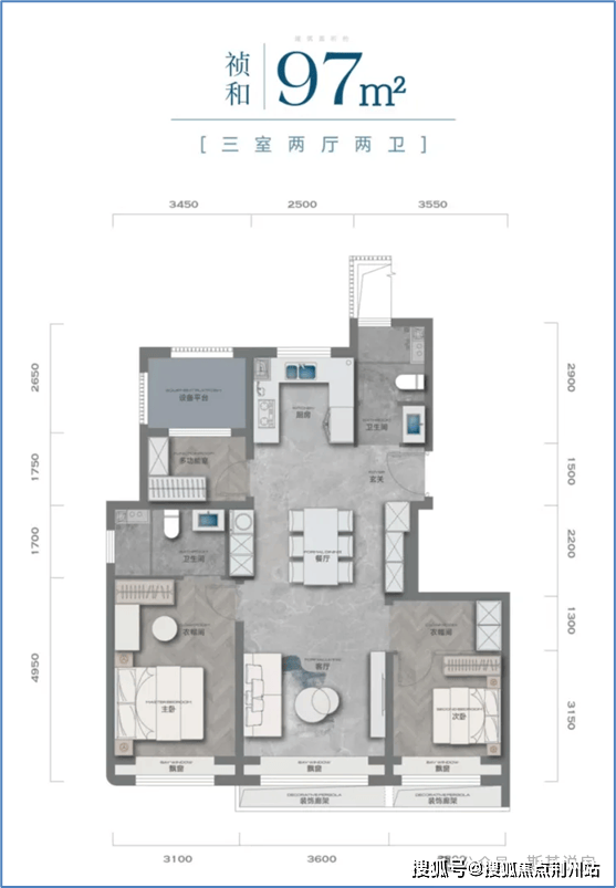 97㎡户型,三室两厅两卫,卫生间北侧挑空井,后期应为设备平台功用;北侧多功能室连接设备平台改造为卧室;南侧三面宽带飘窗,后期改造,南向次卧和客厅的装饰廊架部分为挑空,后期改造接飘窗扩为阳台。